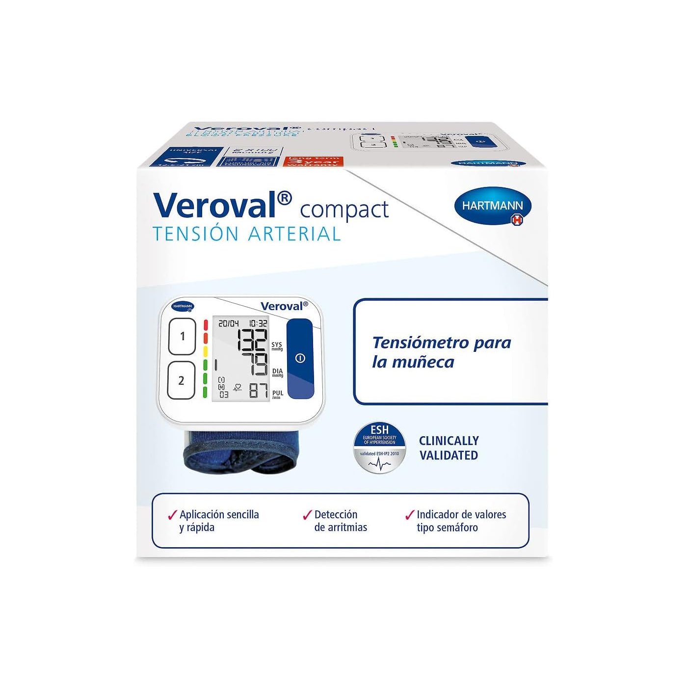Das Veroval Compact Handgelenk-Blutdruckmessgerät bietet genaue, automatische Blutdruck- und Pulsmessungen mit Arrhythmie-Erkennung und Speicher für zwei Benutzer.