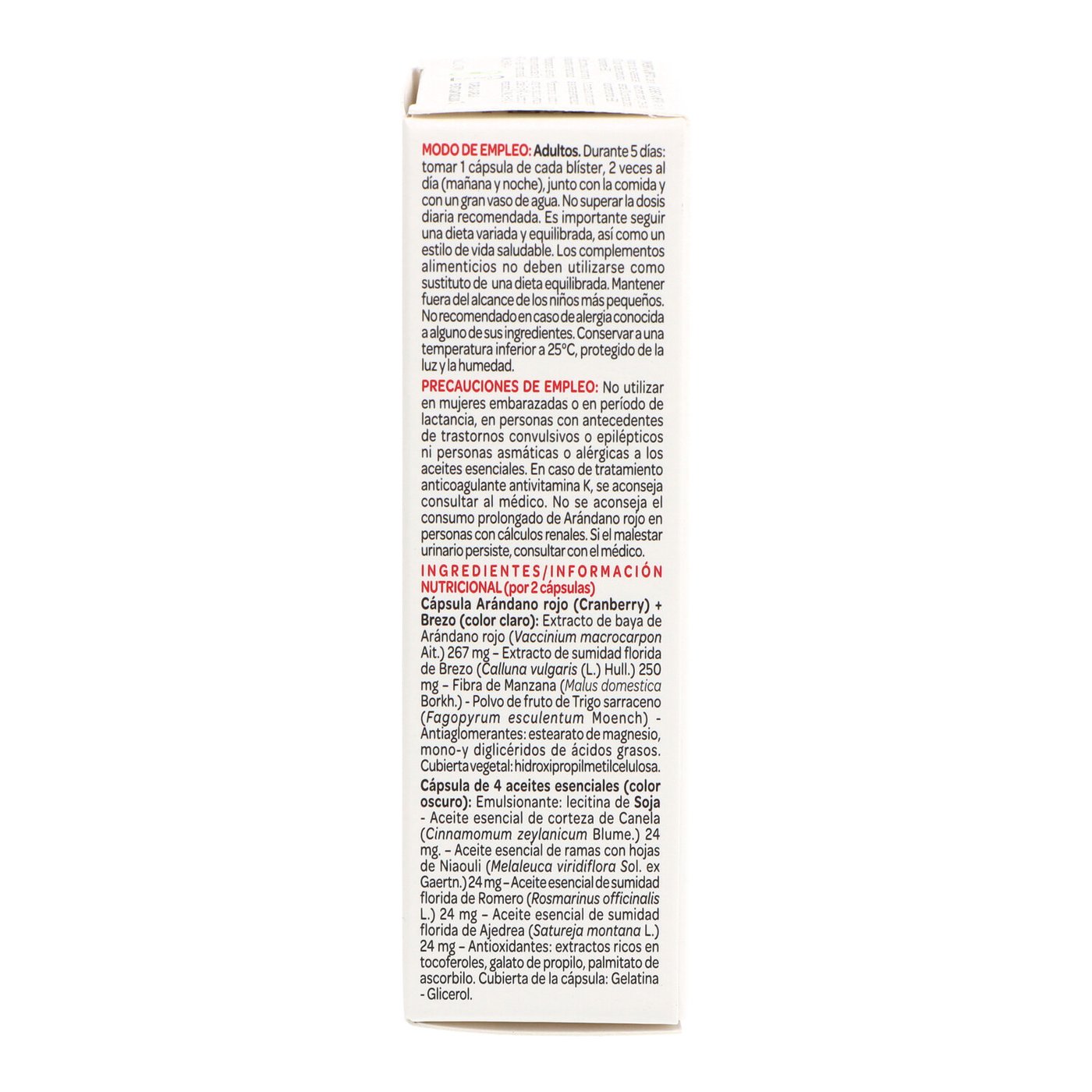 Vaccinum Macrocarpon Extrakt, Calluna vulgaris extrakt, Calciumphosphat, Maisstärke, Zellulose, Siliziumdioxid, Fettsäuremonoglyceride (Emulgator), Diglyceride von Fettsäuren, Stearat Magnesium, Gelatine, Eisenoxid (Farbstoff), Titandioxid, Sonnenblumenlecithin, Sonnenblumenöl, Ätherisches Öl von Cinnamomum zeylanicum Blume, Ätherisches Öl von Melaleuca viridiflora, Rosmarinus officinalis ätherisches Öl, Satureja Montana L., Tocopherol, Hydroxypropylmethylcellulose