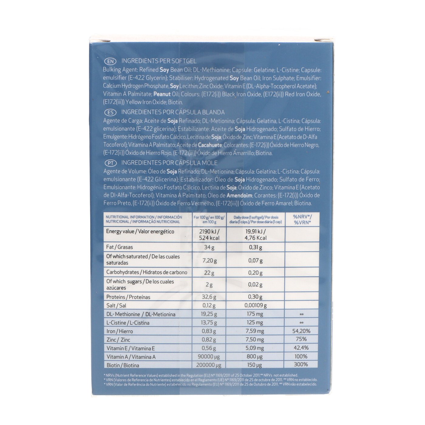 Soybean oil, DL-methionine, Gelatin, L-cystine, Glycerin, Fully Hydrogenated Soybean Oil, Iron sulphate, Inglés Calcium hydrogen phosphate, Soy lecithin, Zinc oxide, Vitamin E, Vitamin A, Peanut oil, Black iron oxide E172, Red iron oxide, Yellow iron oxide, Biotin