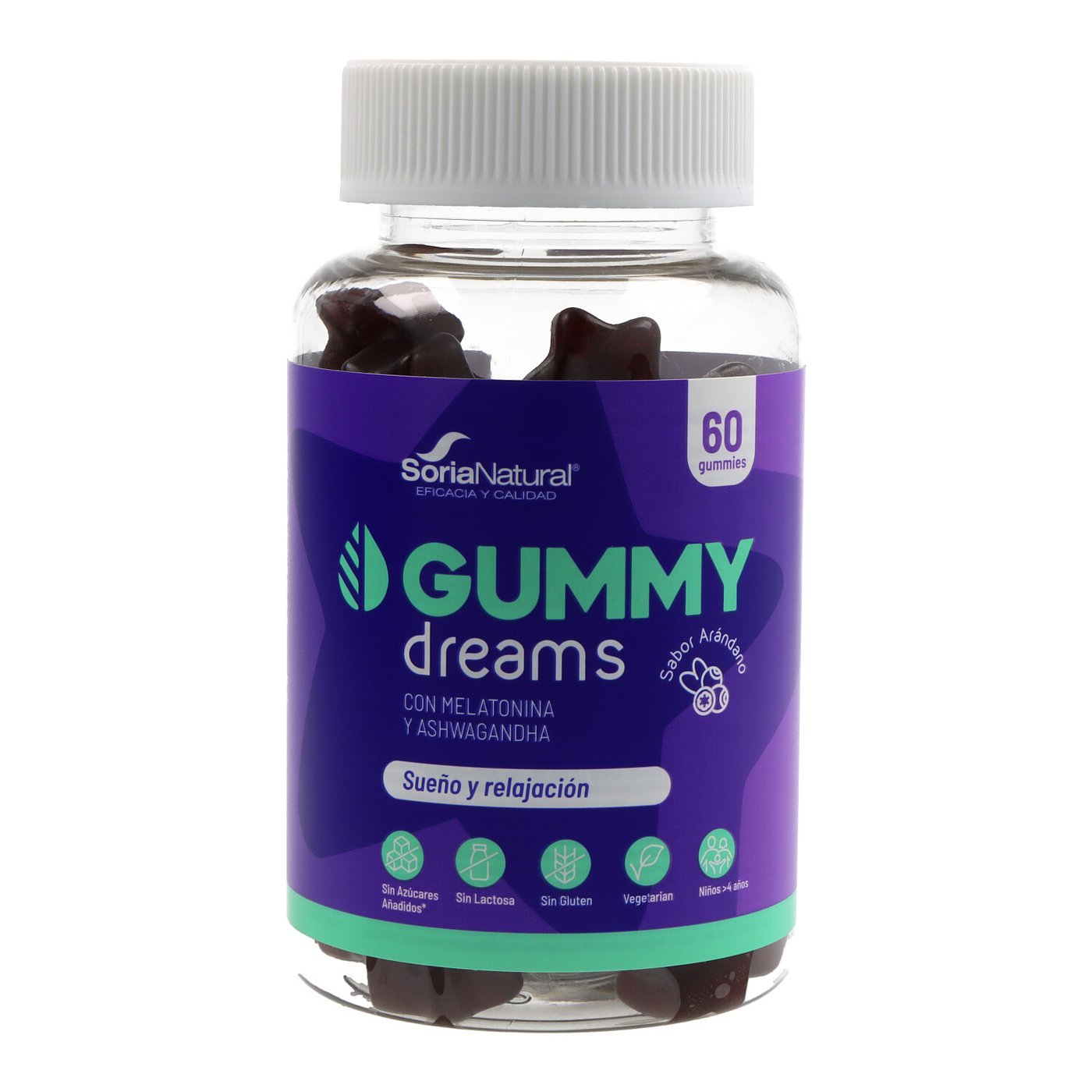 Gummy Dreams de Soria Natural son gominolas con sabor a arándano que combinan melatonina, ashwagandha, triptófano y vitaminas C, B6 y B12, ayudando a reducir el tiempo necesario para conciliar el sueño y promoviendo una relajación óptima.