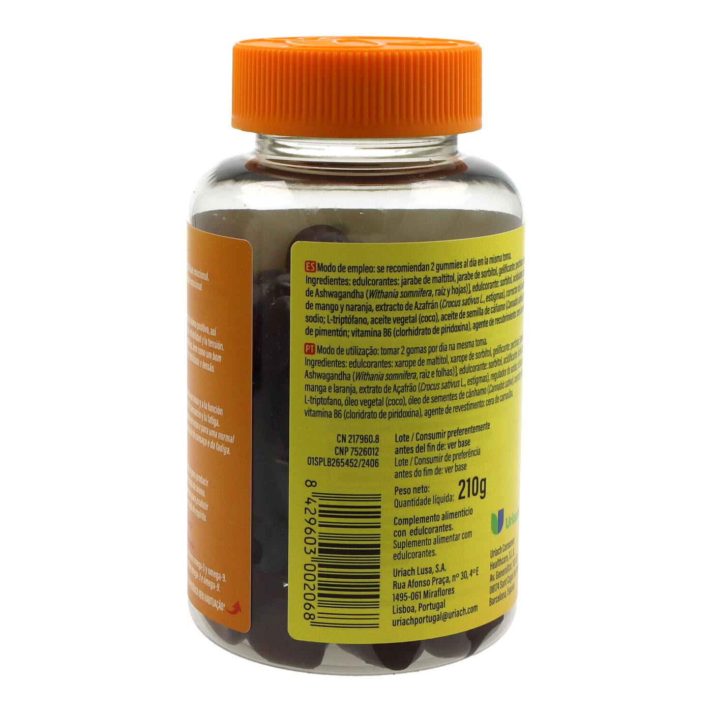 edulcorantes (jarabe de maltitol, jarabe de sorbitol), gelificante (pectinas), extracto de ashwagandha Sensoril® (Withania somnifera, raíz y hojas), acidulante (ácido cítrico), aromas de mango y naranja, extracto de azafrán (Crocus sativus L., estigmas), corrector de la acidez (citratos de sodio), L-triptófano, aceite vegetal (coco), aceite de semilla de cáñamo (Cannabis sativa), colorante (extracto de pimentón), vitamina B6 (clorhidrato de piridoxina), agente de recubrimiento (cera de carnauba).