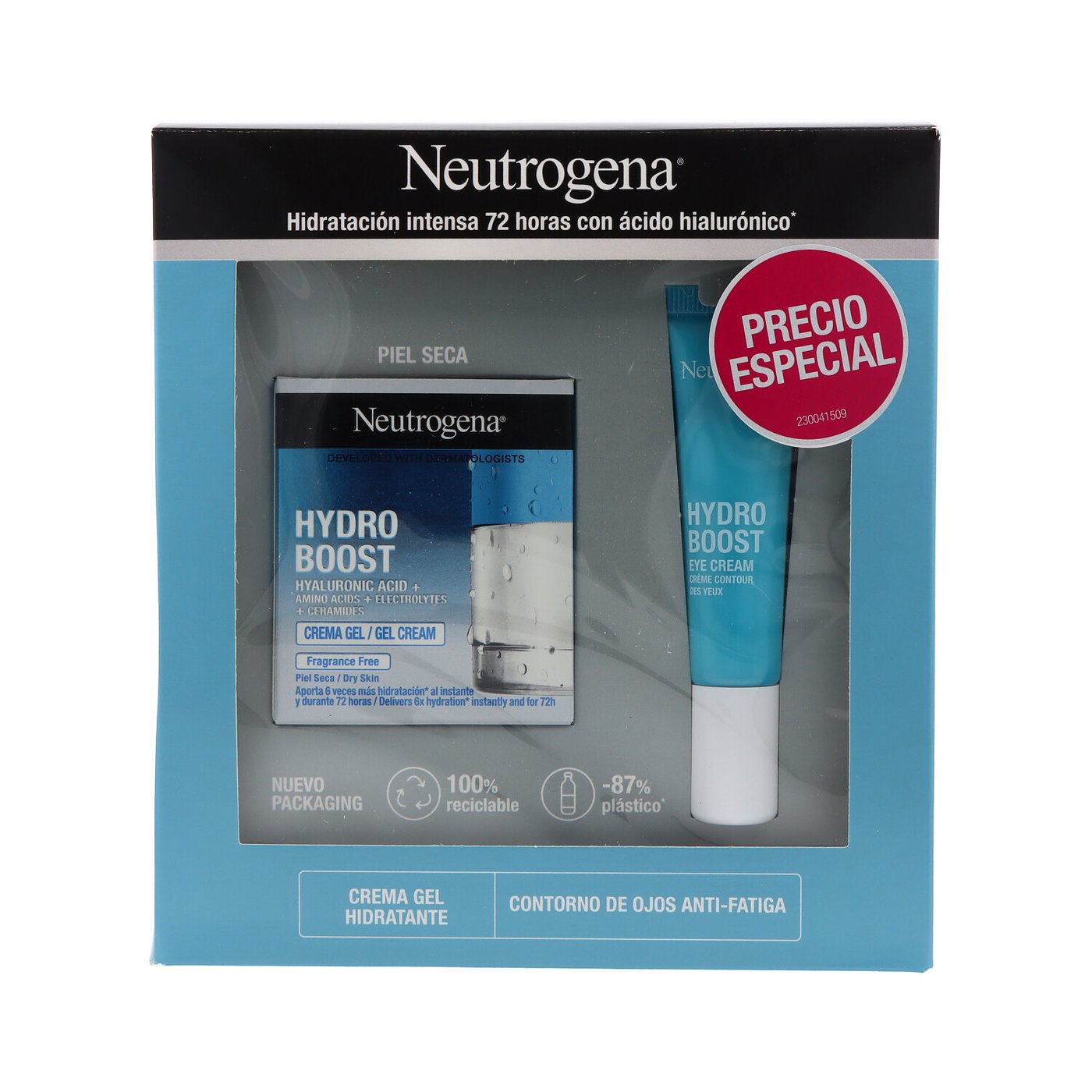 Pack promocional que incluye Neutrogena Hydro Boost Crema Gel 50 ml y Contorno de Ojos Anti-fatiga 15 ml. Ambos productos hidratan intensamente, mejoran la elasticidad y revitalizan la piel del rostro y el contorno de ojos.