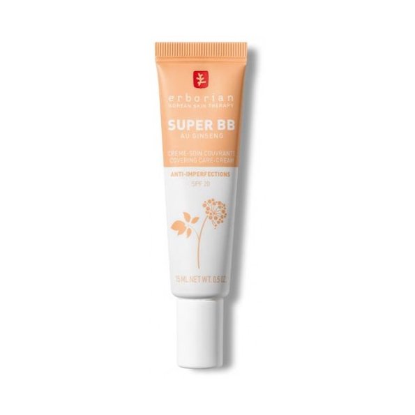 Erborian Super BB Doré 15 ml es una crema facial multifunción que combina maquillaje y tratamiento para la piel. Diseñada para pieles ligeramente bronceadas, ofrece una cobertura elevada que unifica el tono y disimula imperfecciones como rojeces, manchas y poros visibles. Su fórmula enriquecida con ingredientes de la tradición coreana proporciona un acabado natural y luminoso, sin efecto máscara.
