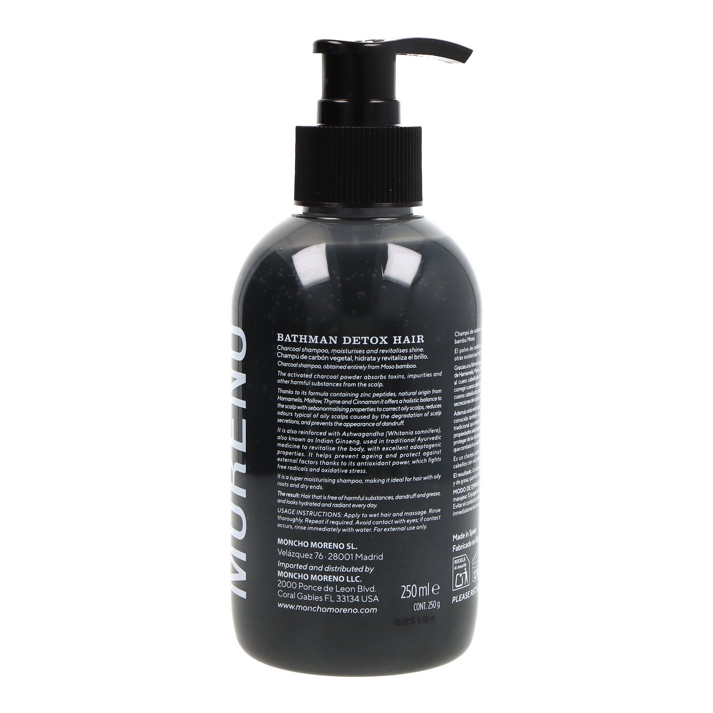 Bathman Detox Hair de Moncho Moreno es un champú diseñado para ofrecer un tratamiento detoxificante al cabello. Su fórmula con carbón activo absorbe impurezas, exceso de grasa y residuos, dejando el cuero cabelludo limpio y equilibrado. La tecnología micelar sin sulfatos ni siliconas permite una limpieza profunda sin irritaciones, resultando en un cabello suelto, hidratado y con brillo natural. Es especialmente adecuado para personas con raíces grasas y puntas secas.