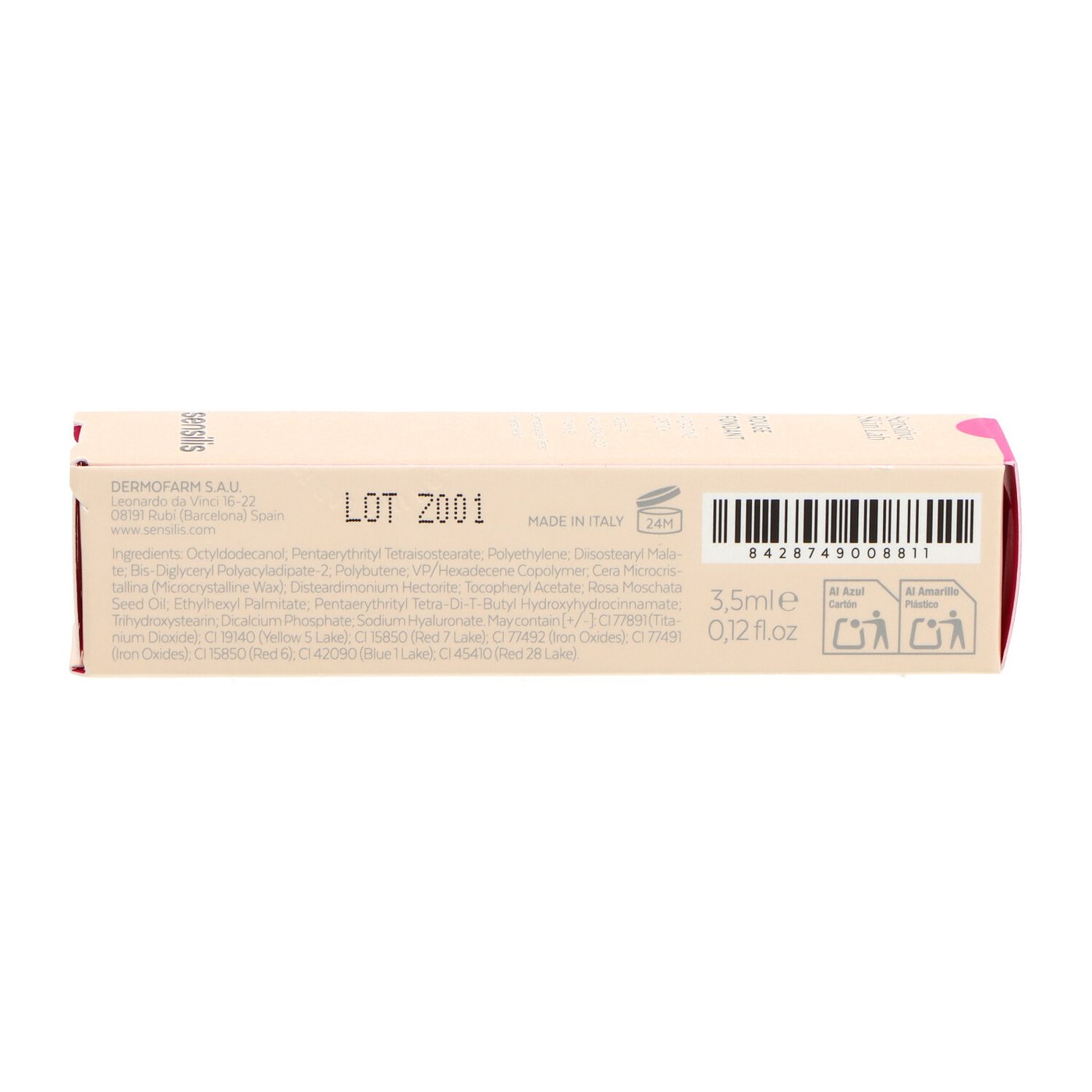 Bálsamo labial color fucsia luminoso 3,5 ml, enriquecido con rosa mosqueta, ácido hialurónico y vitamina E para labios hidratados, suaves y con acabado jugoso.
