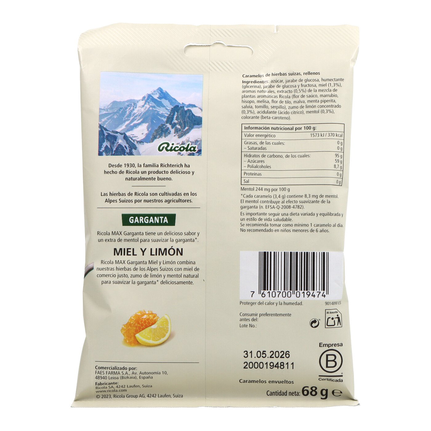 Ricola Max Miel y Limón 70 g (C.N. 218344): caramelos balsámicos con centro líquido, combinan miel, limón, vitamina C y mezcla de hierbas para aliviar garganta y reforzar defensas.