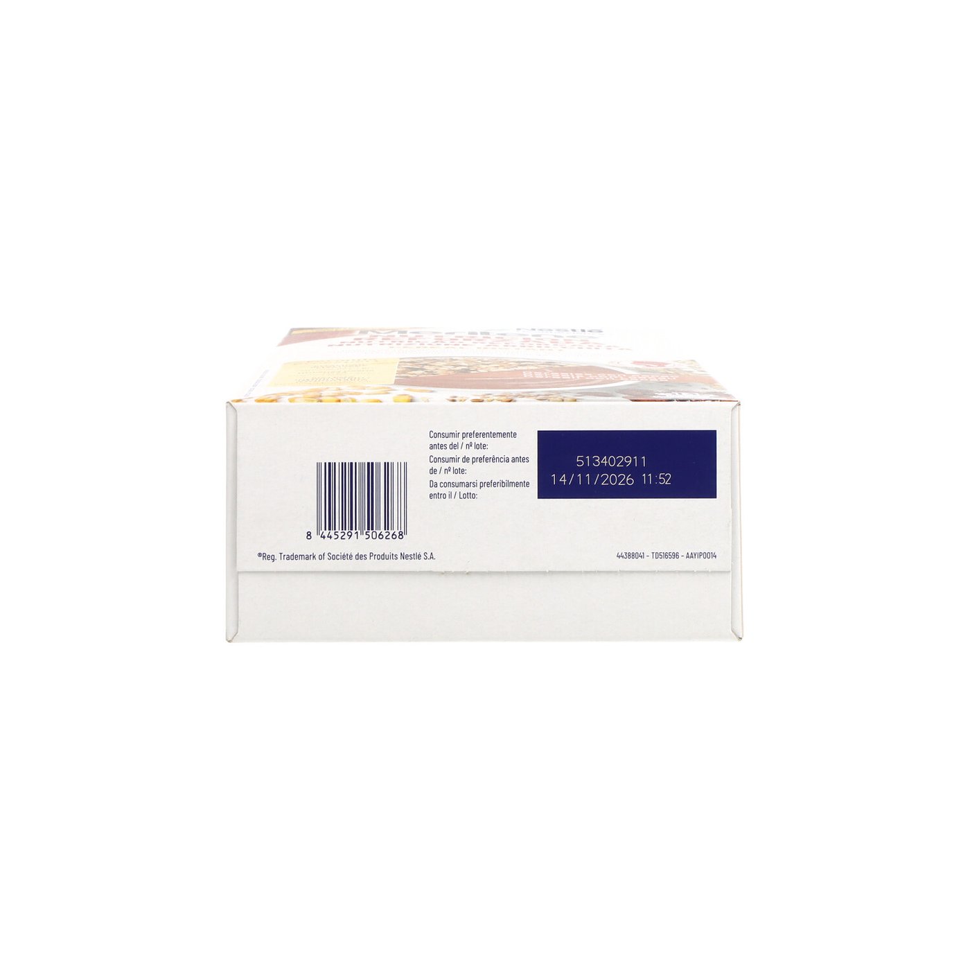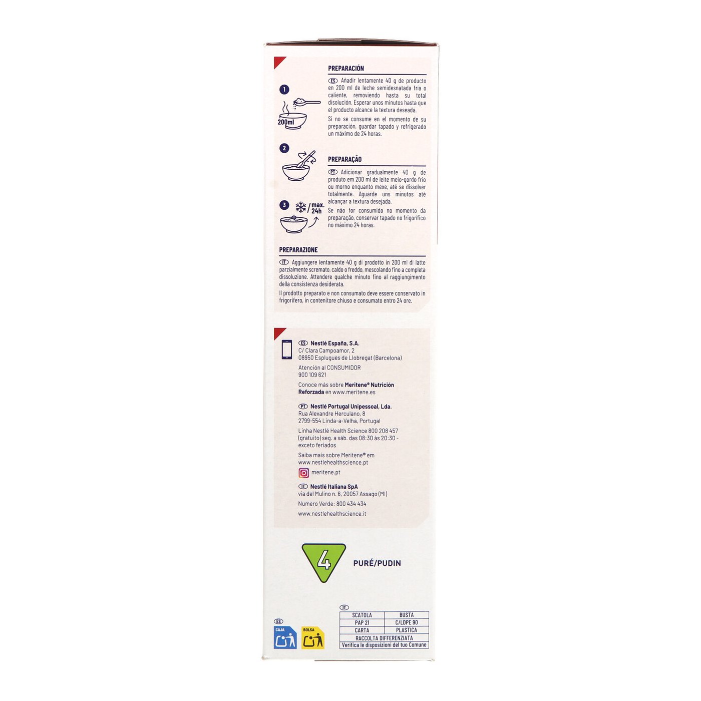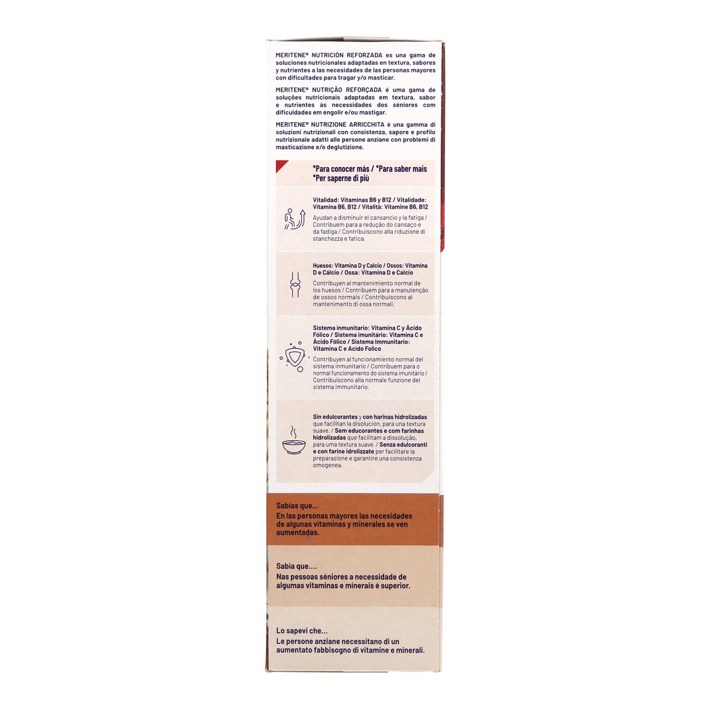 Meritene Cereal Instant Cereales con Cacao es una crema alimenticia en polvo diseñada para cubrir las necesidades nutricionales de adultos, especialmente aquellos con dificultad para tragar o masticar. Con una mezcla de cereales hidrolizados y cacao bajo en grasa, aporta unos 196–250 kcal por ración, junto con proteínas, fibra, calcio, hierro, zinc y vitaminas (B, C, D), apoyando los huesos, el sistema inmunitario y reduciendo la fatiga. Su textura suave y homogénea permite una ingesta cómoda, reconstituida fácilmente con leche o agua.
