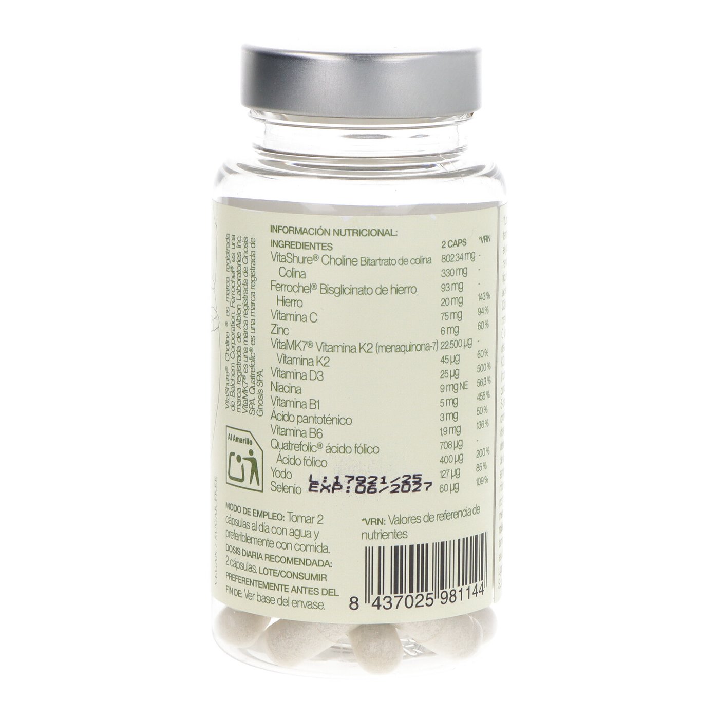 Vitacholine Bitartrato de colina 802,34 mg (colina 330 mg), Ferrochel Bisglicinato de hierro 93 mg (hierro 20 mg), Vitamina C 75 mg, Zinc 6 mg, VitaMK7 Vitamina K2 (menaquinona‑7) 22.500 µg (K2 45 µg), Vitamina D3 25 µg, Niacina 9 mg NE, Vitamina B1 5 mg, Ácido pantoténico 3 mg, Vitamina B6 1,9 mg, Quatrefolic ácido fólico 708 µg (ácido fólico 400 µg), Yodo 127 µg, Selenio 60 µg