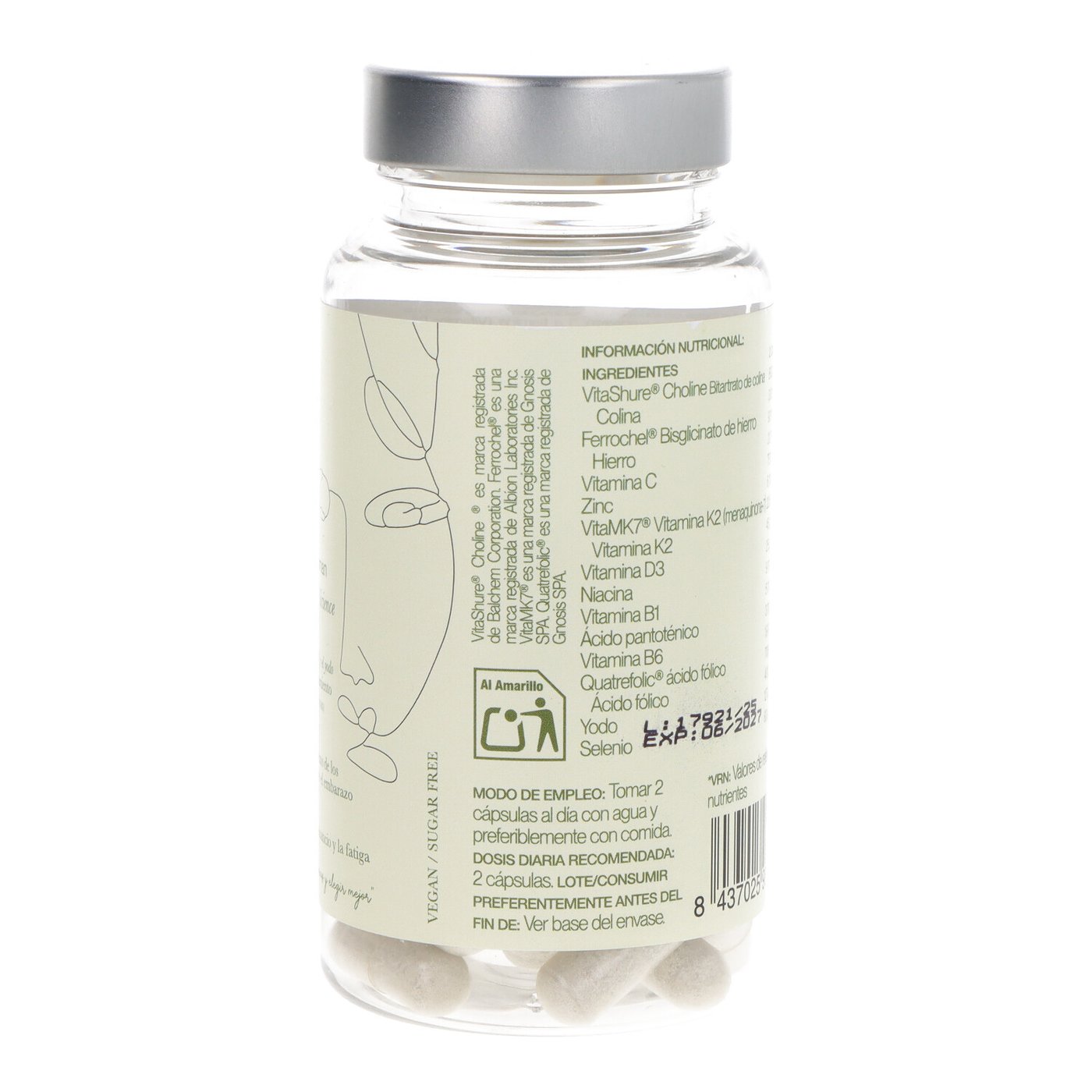Complejo prenatal vegano sin azúcar que aporta colina, ácido fólico activo, hierro biodisponible, vitaminas D, K2, B‑complex, yodo, selenio y más, para nutrir a la mujer desde la preconcepción hasta la lactancia, favoreciendo el desarrollo saludable del bebé.