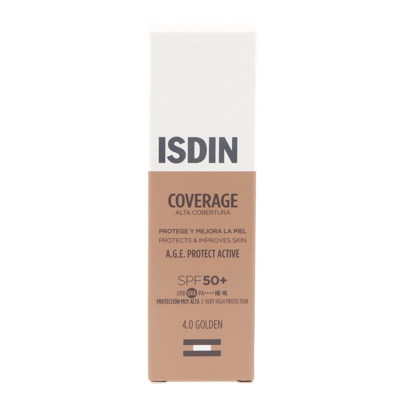 ISDIN Coverage 30 g Color 4.0 Golden: maquillaje fluido con SPF 50+, cobertura natural y tono dorado luminoso para pieles medias a bronceadas.