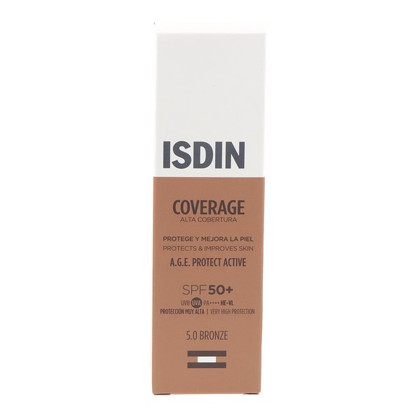 ISDIN Coverage 30 g Color 5.0 Bronze: maquillaje fluido con SPF 50+, cobertura modulable y tono bronce ideal para pieles morenas o bronceadas.