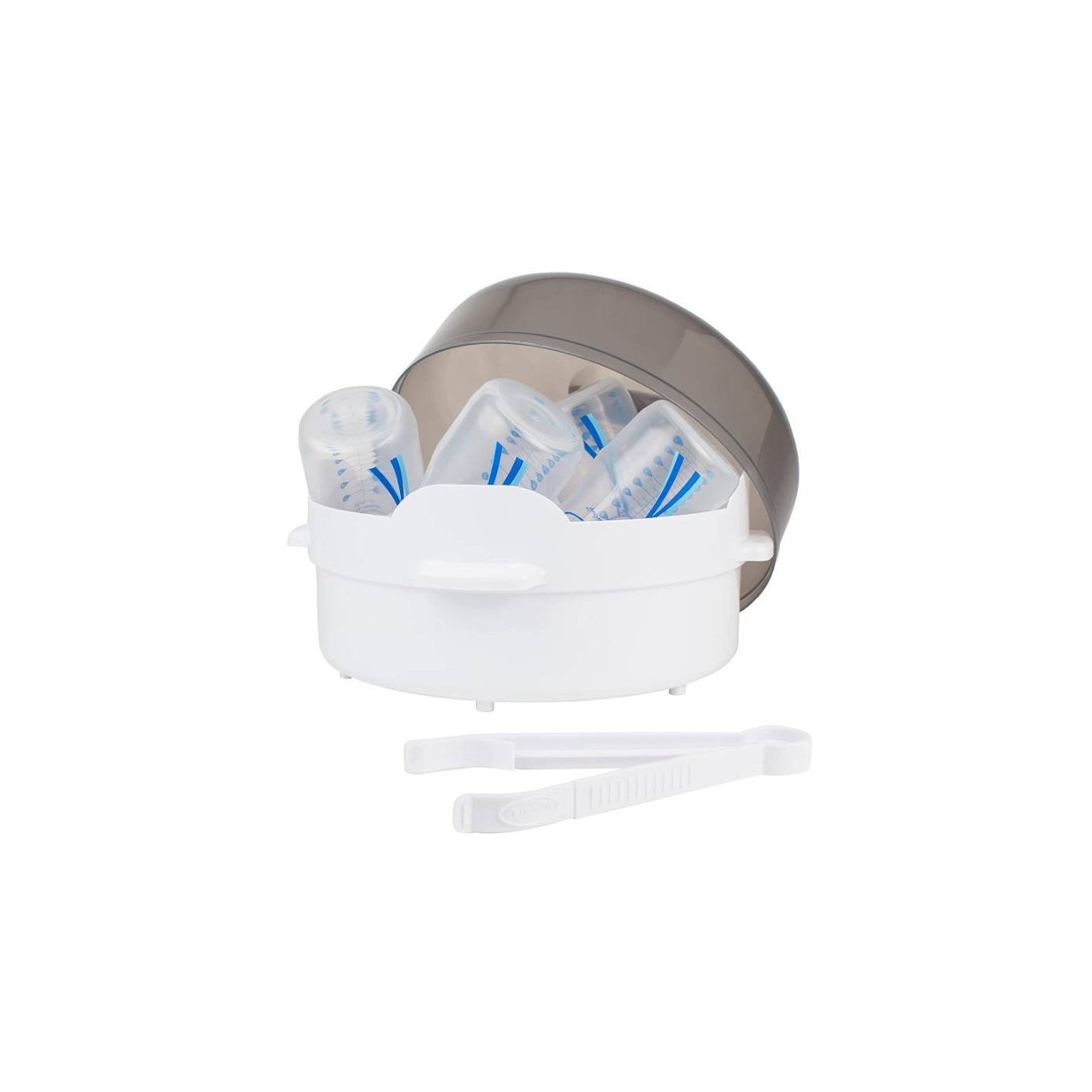 Esterilizador de vapor para biberones Dr. Brown's que esteriliza de forma segura hasta 4 unidades a la vez. Incluye pinzas para manipular los biberones esterilizados. Medidas: 26.5 x 17 cm (ancho x alto).