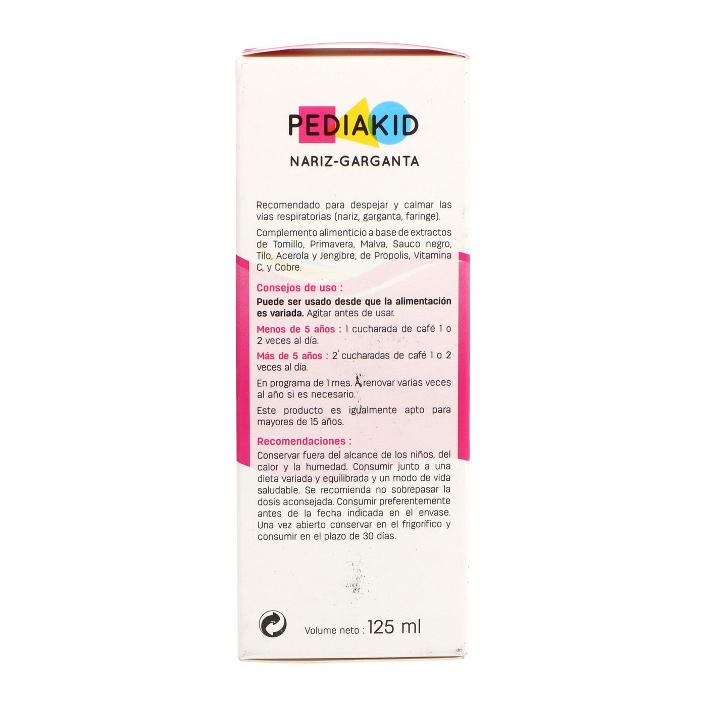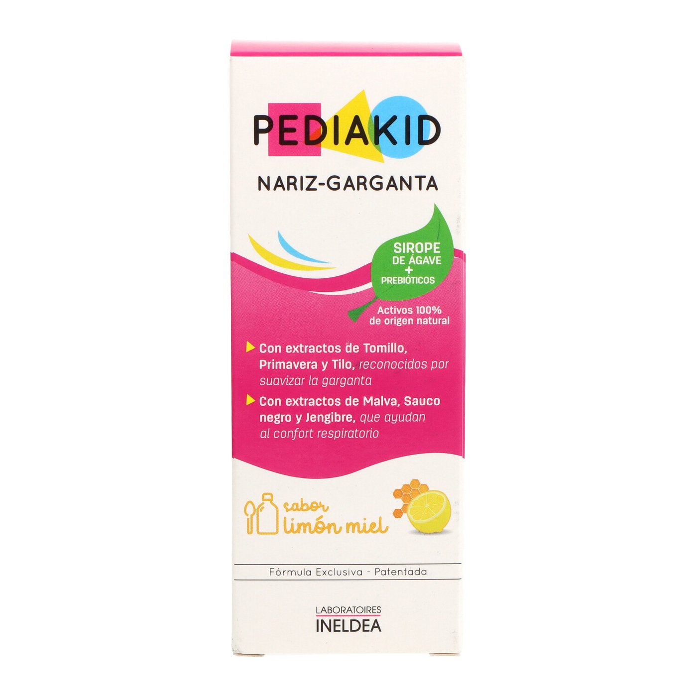 Pediakid Jarabe Nariz y Garganta es un complemento infantil que alivia mucosidad y calma la garganta con extractos de tomillo, malva, saúco, jengibre, própolis y vitamina C. Sabor miel-limón, sin gluten ni ingredientes animales. Ideal para niños mayores de 3 años.