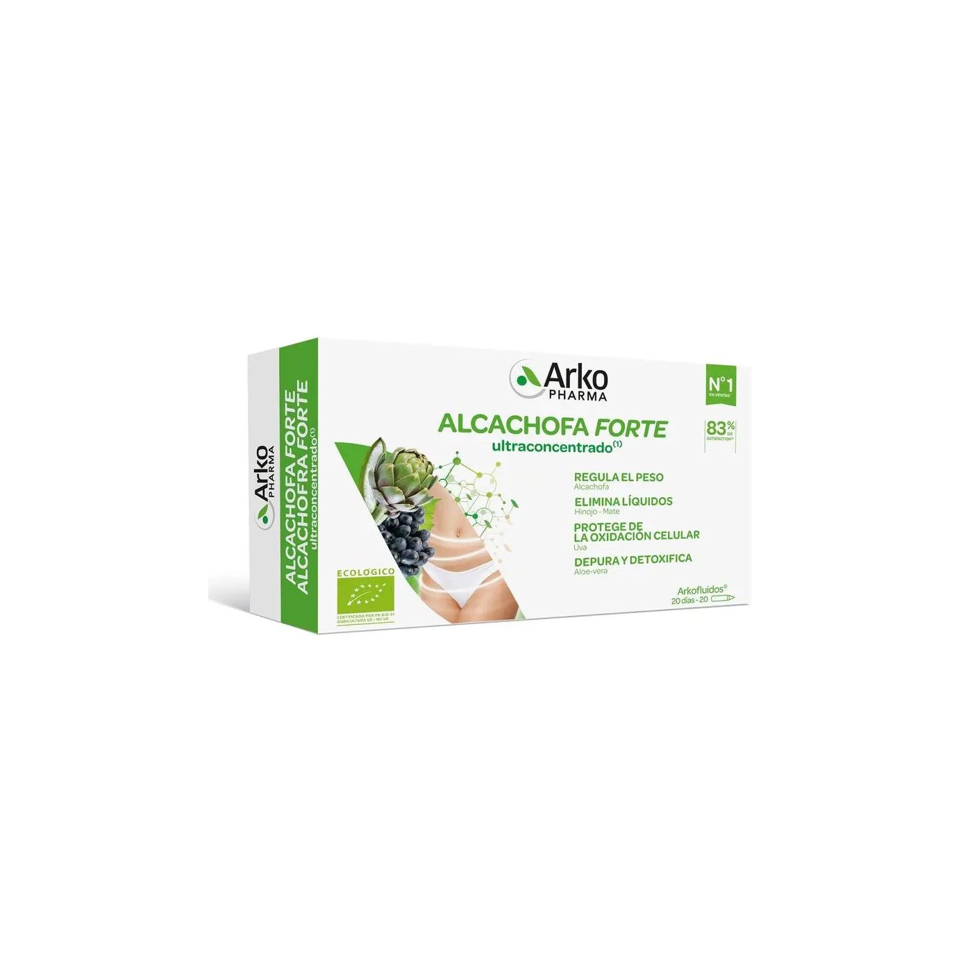 Arkofluido Alcachofa Forte es un complemento alimenticio en formato de ampollas bebibles que combina extractos ecológicos de alcachofa, hinojo, mate, uva y aloe vera. Su tecnología de extracción Ultra-Extract® garantiza una elevada concentración de activos naturales para apoyar la función hepática, la eliminación de líquidos, el metabolismo lipídico y la depuración general.
