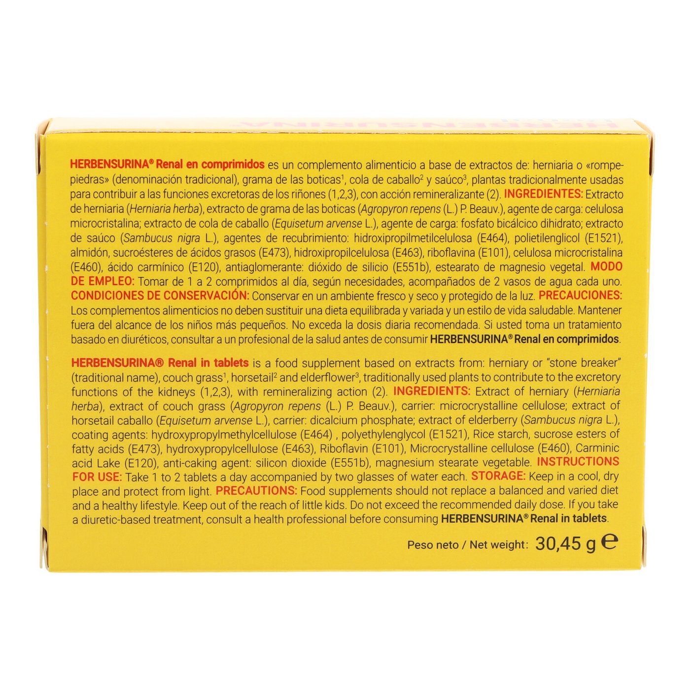 Herbensurina 30 comprimidos (referencia 166911, EAN 8430022001617) es un complemento con una fórmula vegetal tradicionalmente usada para mantener los riñones limpios y apoyar la eliminación de líquidos. Se emplea como apoyo en la prevención y tratamiento de arenillas y cálculos renales. La marca detrás es Herbensurina, comercializado por Deiters.