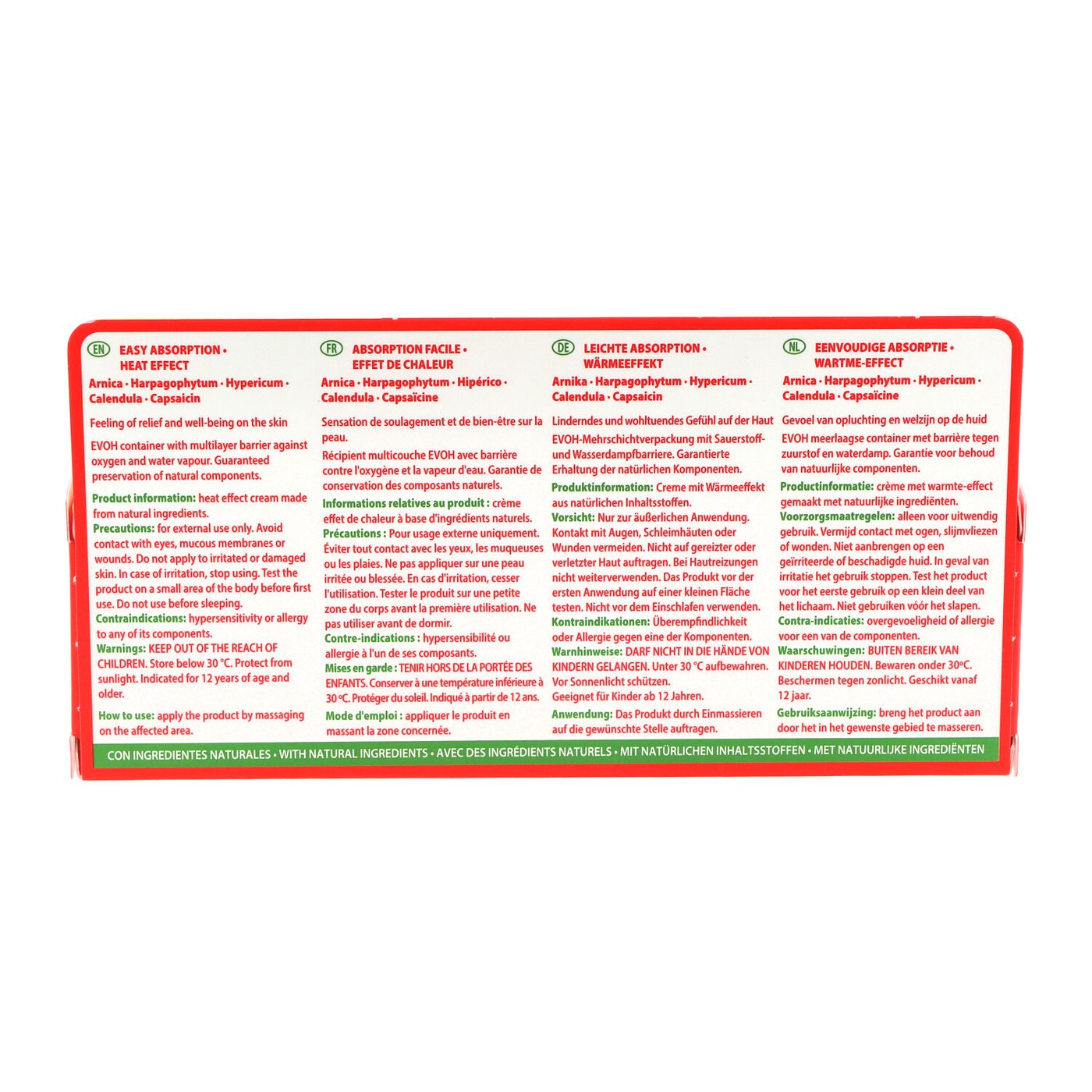 Aqua (Agua), Aceite de semilla de helianthus annuus, Glicerina, Mentol, Camphor, Aceite de hoja de eucalipto globulus, Alcohol cetearílico, Estearato de glicerilo, Estearato de PEG-100, Trementina, Extracto de flor de Arnica Montana, Oxalato de metiletilamido, Aceite de abies sibirica, Aceite esencial de Mentha piperita (Menta piperita), Triglicérido caprílico / cáprico, Caprilil glicol, Extracto de Calendula officinalis, Extracto de raíz de Harpagophytum Procumbens, Aceite de Eugenia Caryophyllus, Eugenol, 1,2-hexanediol, Vanilil butil éter, Extracto de Capsicum Frutescens, Eucaliptol, Aceite de cajaputi melaleuca leucadendron, Pentilenglicol, Crospolímero de Acrilatos/C10-30 Alquil Acrilato , Extracto de Hypericum perforatum, Acetato de tocoferilo, Decilenglicol, Limoneno, Hidróxido de sodio, Linalool, Hidroximetoxifenil decanona, Palmitato de ascorbilo