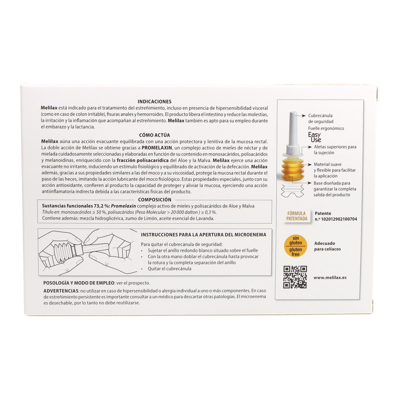 Melilax Adultos es un microenema de miel que alivia el estreñimiento en adultos, incluso en casos de hipersensibilidad visceral, fisuras anales y hemorroides, proporcionando una acción evacuante y protectora de la mucosa rectal.