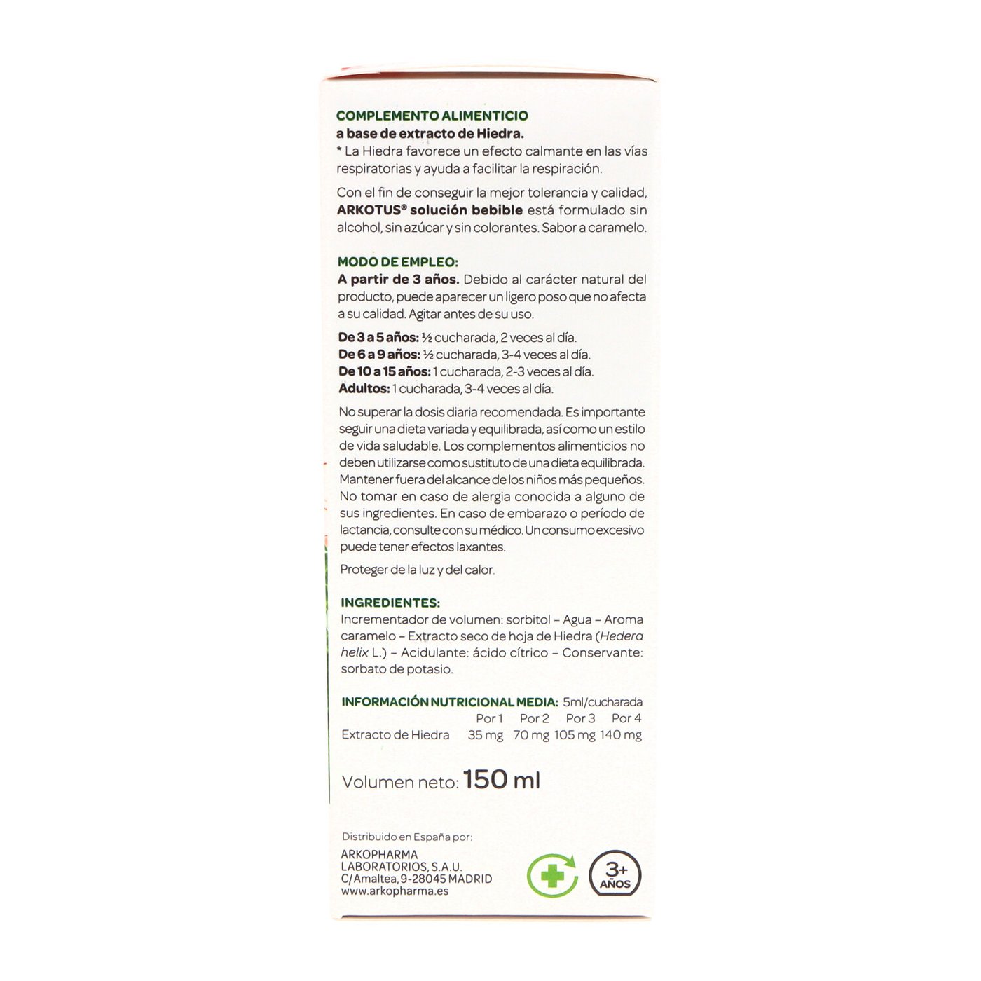 Arkotus jarabe complemento alimenticio a base que extracto de hiedra, que tiene un efecto calmante de las vías respiratorias y ayuda a facilitar la respiración. Tiene un agradable sabor a caramelo.