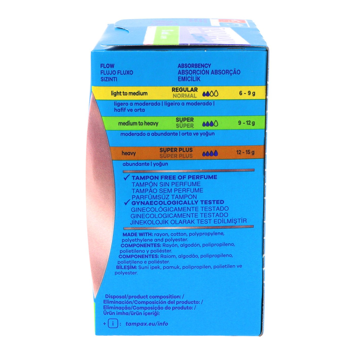 Los tampones Tampax Compak Pearl Super están compuestos por rayón y/o fibras de algodón y poliéster. El aplicador está hecho de plástico.