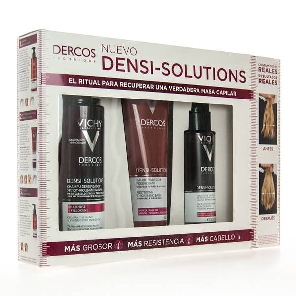La promoción incluye: VICHY DERCOS DENSI-SOLUTION champú densificador, 250ml + DERCOS DENSI-SOLUTION bálsamo densificador reconstruyente para cabello fino y debilitado, 150ml + DERCOS DENSI-SOLUTION concentrado creador de masa capilar, 100ml.