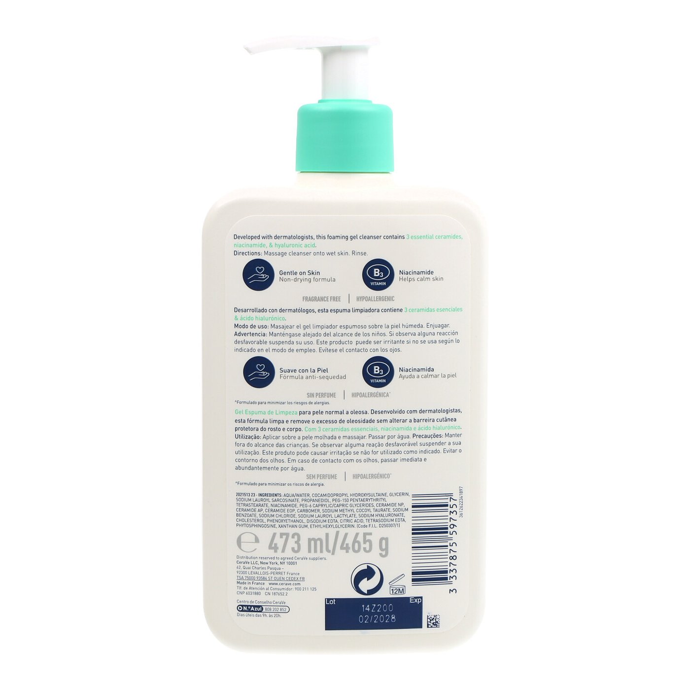 Gel limpiador espumoso de CeraVe diseñado para piel normal a grasa, limpia profundamente sin alterar la barrera cutánea.COMPOSICIÓN DEL PRODUCTO
