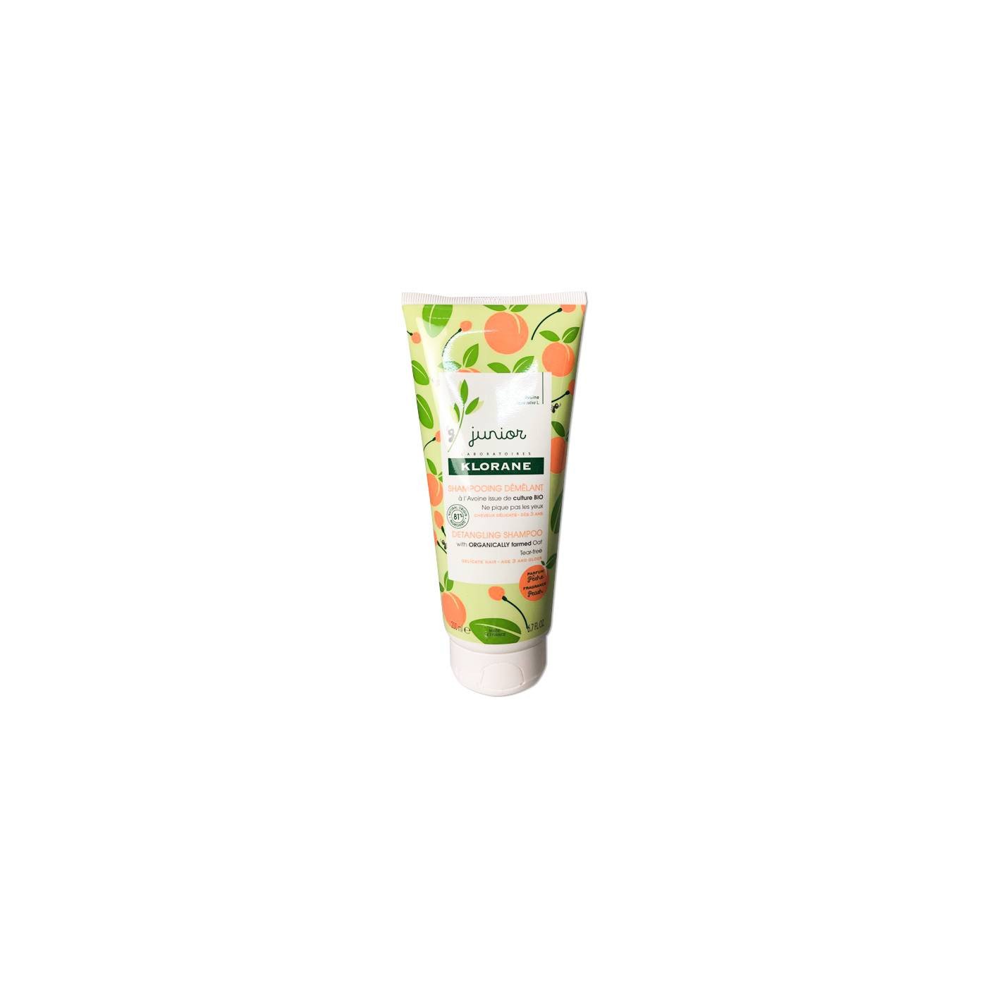 Champú desenredante Klorane Petit Junior con leche de avena suave y calmante para niños a partir de 3 años. Su fórmula sin jabón y con agradable perfume a melocotón facilita el desenredo del cabello.