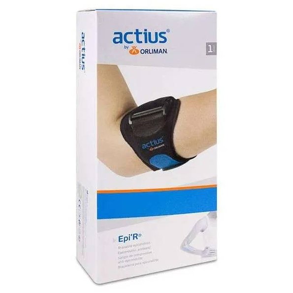 Brazalete Epicondilitis Actius, recomendado para prevenir y tratar lesiones deportivas como la epicondilitis y epitrocleitis. Fabricado con materiales almohadillados de alta resistencia y termoplástico moldeado. Ajustable con cincha de cierre y banda elástica. Color gris. No contiene látex.