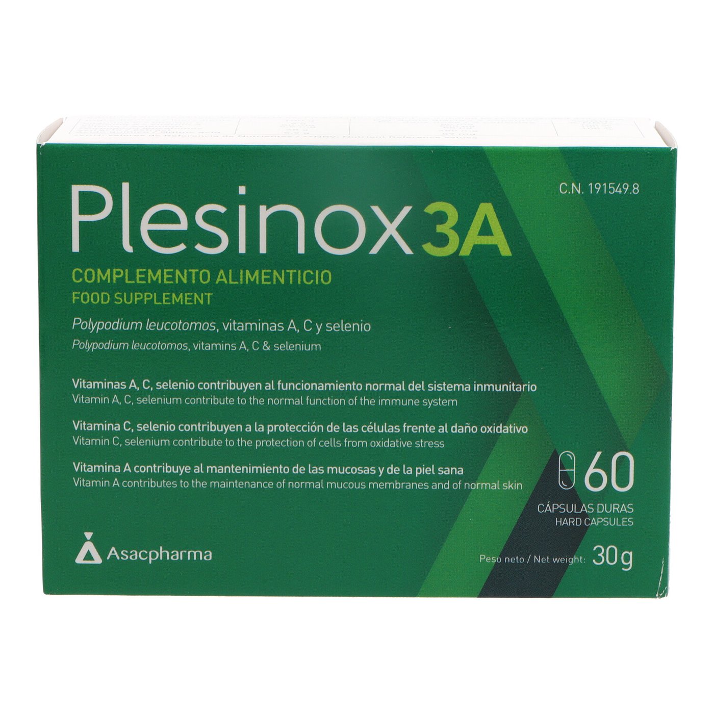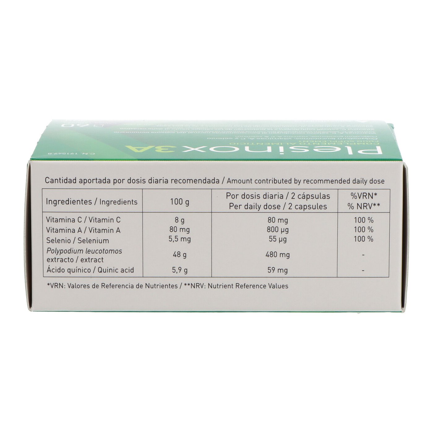 Plesinox 3 A es un suplemento que combina Polypodium leucotomos (una planta tropical con acción antioxidante y inmunoestimulante) con vitaminas A y C, y selenio. Su enfoque sinérgico ayuda a fortalecer el sistema inmunitario, proteger las células del daño oxidativo y mantener piel y mucosas en buen estado.