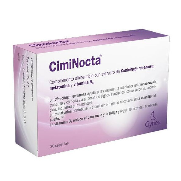 Ciminocta es un suplemento diseñado para mujeres en la menopausia, que ayuda a controlar los síntomas como sofocos, sudoraciones y dificultades para conciliar el sueño. Su composición incluye extracto de Cimicifuga racemosa, melatonina y vitamina B6, ofreciendo un apoyo integral durante este período de cambios.