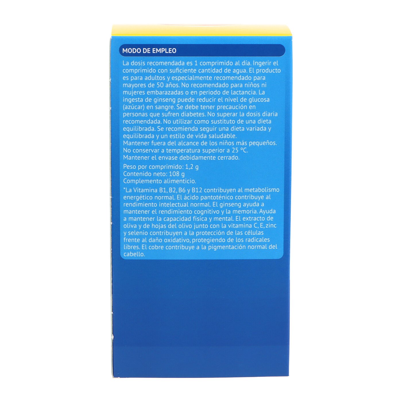 Vitamina A 400 µg, Vitamina D 5 µg, Vitamina E 24 mg, Vitamina B1 1,65 mg, Vitamina B2 2,10 mg, Niacina 24 mg, Ácido pantoténico 9 mg, Vitamina B6 2 mg, Ácido fólico 200 µg, Vitamina B12 2,5 µg, Biotina 75 µg, Vitamina C 160 mg, Calcio 120 mg, Magnesio 60 mg, Hierro 7 mg, Cobre 1 mg, Yodo 75 µg, Zinc 10 mg, Manganeso 0,5 mg, Selenio 50 µg, Molibdeno 50 µg, Ginsenósidos 0,200 mg en forma de extracto seco de Ginseng (26,7 mg por comprimido), Polifenoles de oliva 5 mg, Oleuropeína 4,5 mg en forma de extracto de hojas de olivo titulado al 21% (21,43 mg por comprimido), Hidroxitirosol 0,5 mg en forma de extracto de fruto de olivo titulado al 10% (5,00 mg por comprimido).