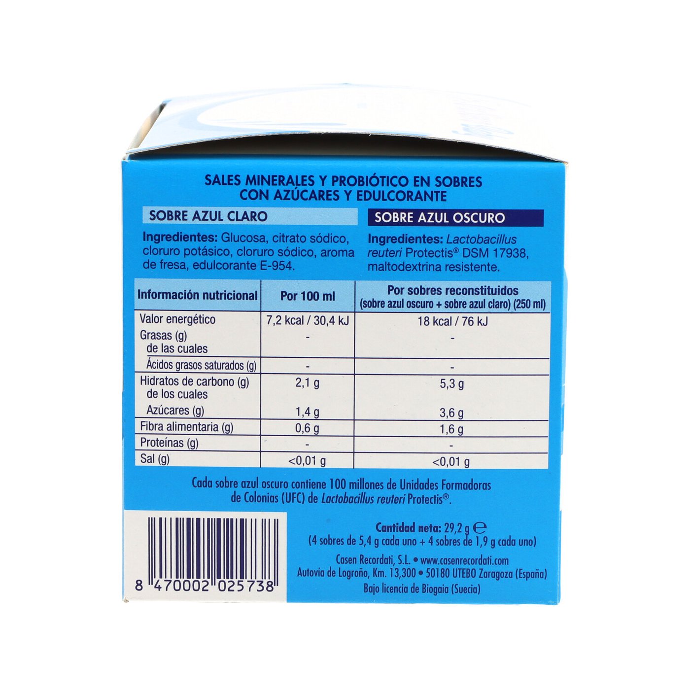 - Sobre azul oscuro: Lactobacillus reuteri Protectis® DSM 17938 (100 millones de u.f.c.), maltodextrina resistente.