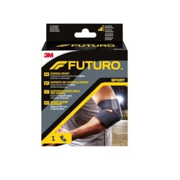 La Codera Futuro Sport, talla única, proporciona soporte y alivio para codos rígidos, doloridos o lesionados, ideal para actividades deportivas como el tenis o el golf. Fabricada con neopreno, ofrece comodidad, calidez y sujeción, y cuenta con tiras ajustables para un ajuste personalizado.