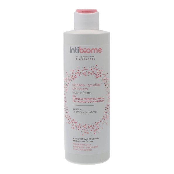 Intibiome Cuidado 50 Años 250 ml cuida el microbioma íntimo para reforzar las defensas naturales, con pH neutro, prebióticos y extracto de caléndula para aliviar la sequedad en mujeres en la menopausia. Formulado con limpiadores a base de plantas, sin jabón ni sulfatos.