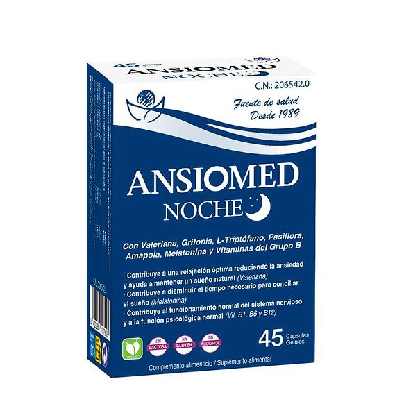 Ansiomed Noche 45 Cápsulas: fórmula con extractos de plantas, melatonina y vitaminas del grupo B para conciliar el sueño y función psicológica normal.
