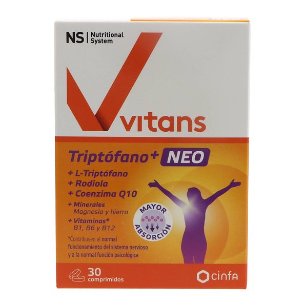 Complemento alimenticio NS Vitans Triptófano+ Neo, 30 comprimidos (Ref. 206583). Combina triptófano, coenzima Q10 y vitaminas B, ideal para mejorar el estado de ánimo, reducir estrés y fatiga.