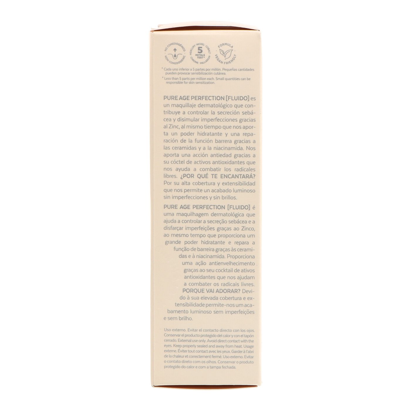 Maquillaje antí-imperfecciones Sensilis Pure Age Perfection Fluid, tono 04 Peche Dore. Perfecto para pieles sensibles, cubre imperfecciones y unifica el tono. Proporciona un acabado natural y radiante.COMPOSICIÓN DEL PRODUCTO