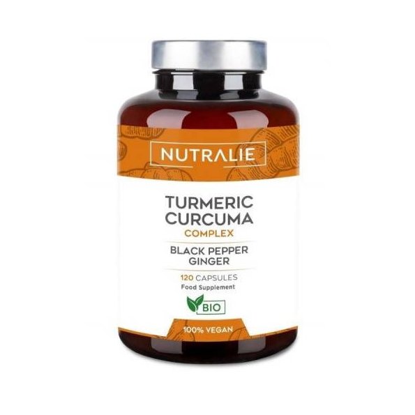 El suplemento Nutralie Turmeric Cúrcuma Complex combina tres ingredientes naturales: cúrcuma, jengibre y pimienta negra, todos procedentes de agricultura ecológica. Esta fórmula está diseñada para apoyar la salud articular y digestiva, gracias a las propiedades antiinflamatorias y antioxidantes de sus componentes. Las cápsulas son de origen vegetal, aptas para veganos y no contienen gluten ni lactosa.