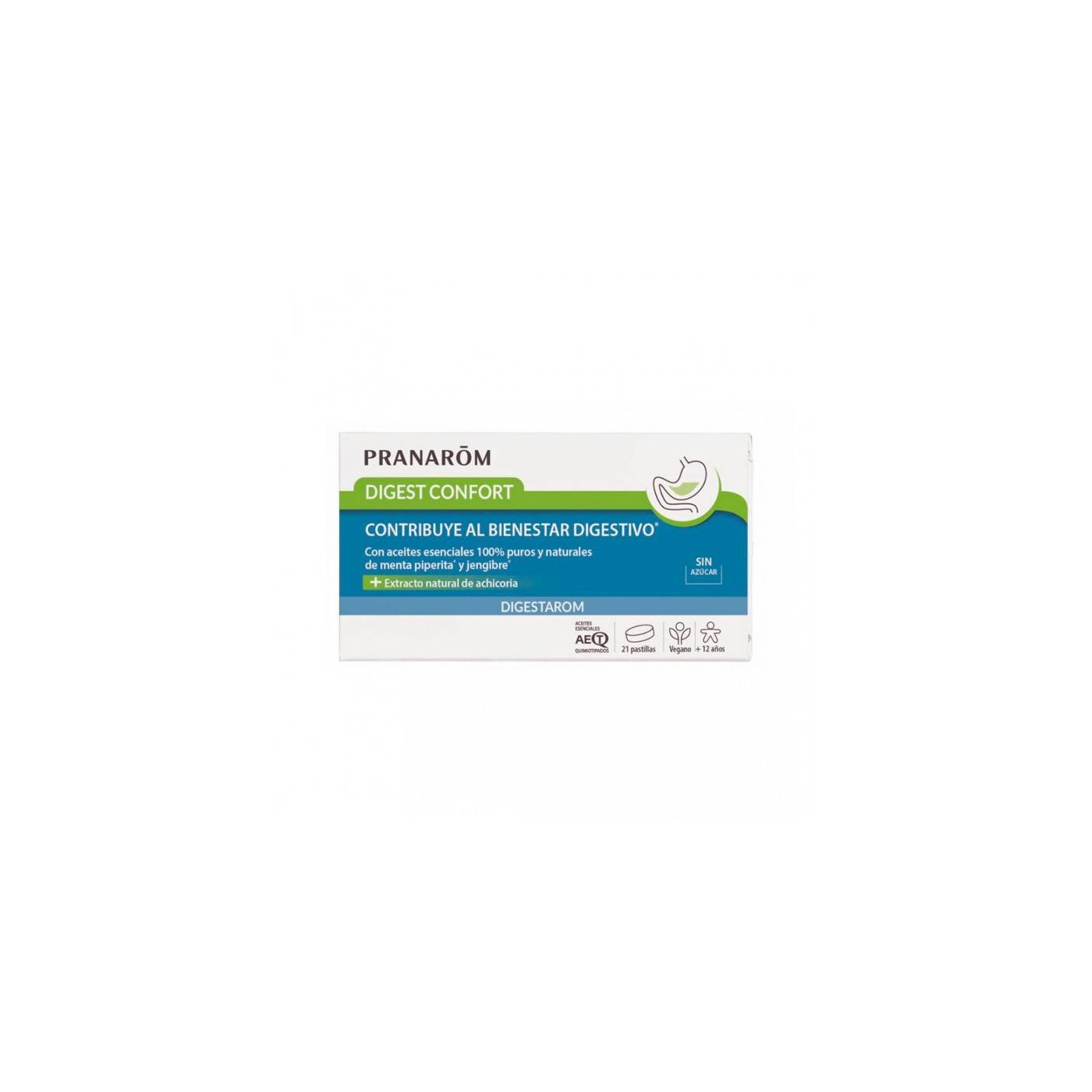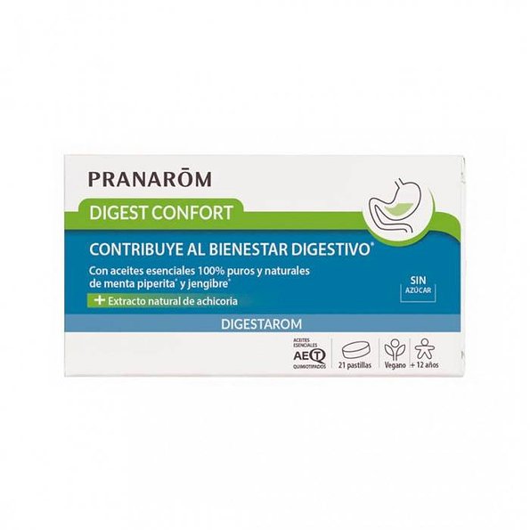 Digest Confort de Pranarôm es un complemento alimenticio formulado especialmente para aliviar molestias digestivas como pesadez, gases, náuseas y digestiones lentas. Con 21 comprimidos masticables o para chupar, contiene aceites esenciales 100 % puros de menta piperita y jengibre, junto con extracto natural de achicoria, ingredientes que actúan sinérgicamente para mejorar el confort tras comidas copiosas y prevenir malestar por cambios alimentarios o viajes
