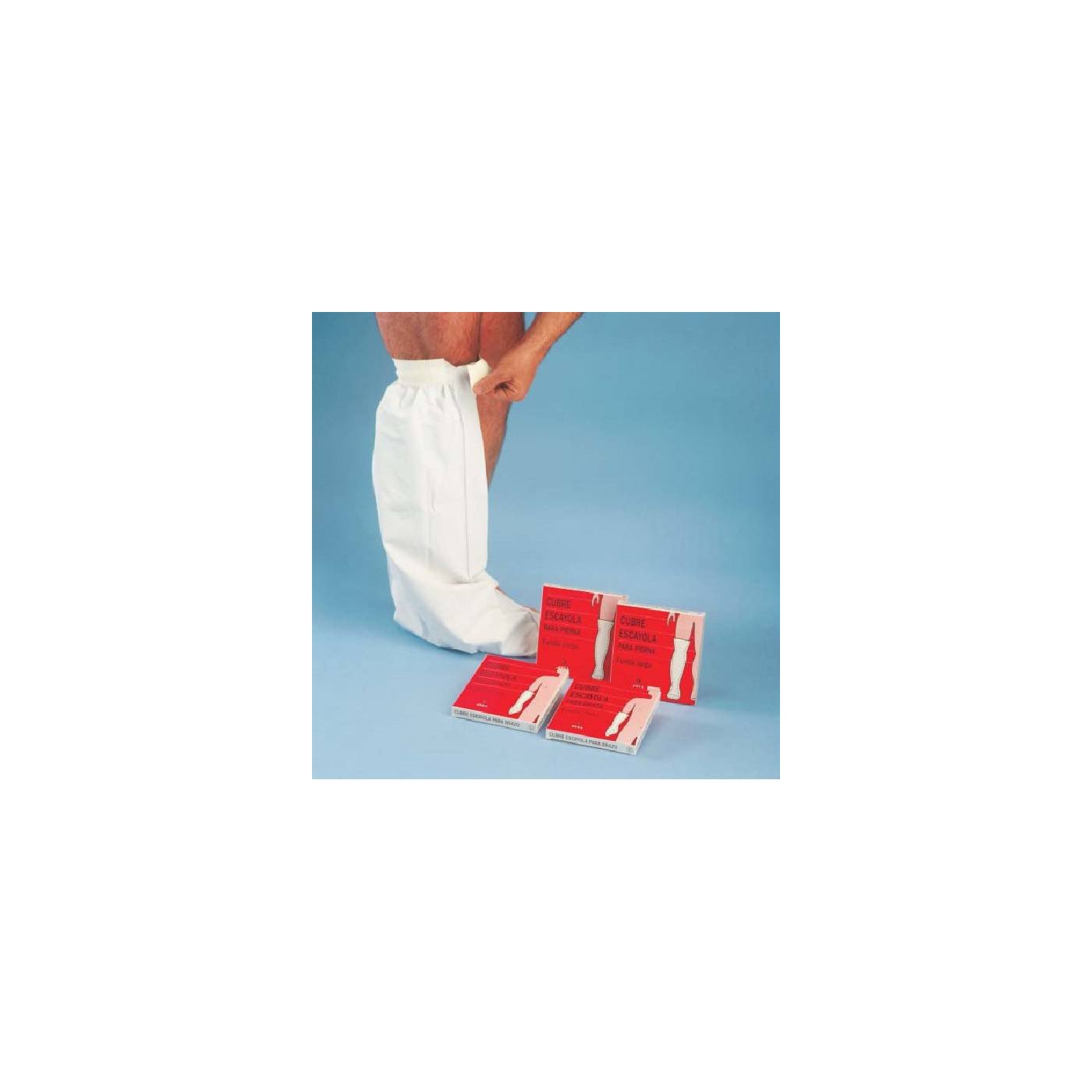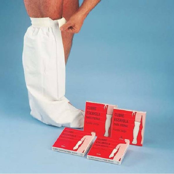 Cubre escayola para pierna corta de color blanco, diseñado para proteger la escayola o vendaje del miembro indicado. Cuenta con un cierre Velcro ajustable que garantiza su sujeción y evita la entrada de agua durante el baño o ducha.COMPOSICIÓN DEL PRODUCTO