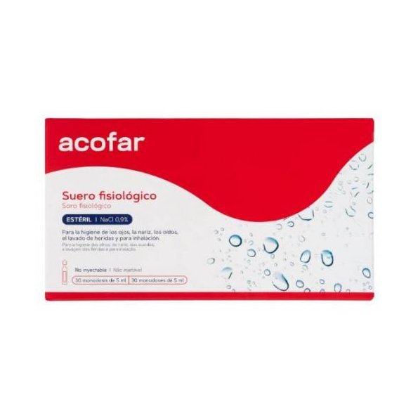 Suero fisiológico en monodosis de 5ml de Acofar, ideal para higiene nasal, ocular, auricular y lavado de heridas. Uso seguro y individual, apto para toda la familia.