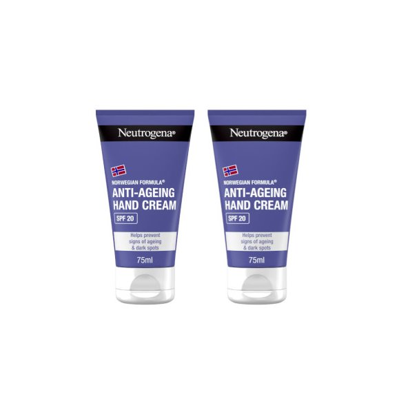 **Neutrogena Crema de Manos Antiedad SPF 20** es una crema de uso diario que proporciona hidratación intensa y ayuda a prevenir los signos del envejecimiento y las manchas en la piel. Este producto combina la Fórmula Noruega con minerales activos que estimulan la producción natural de colágeno, mejorando la elasticidad y firmeza de la piel. Su textura de rápida absorción y no grasa deja las manos suaves y protegidas. El pack promocional incluye dos tubos de 75 ml cada uno.