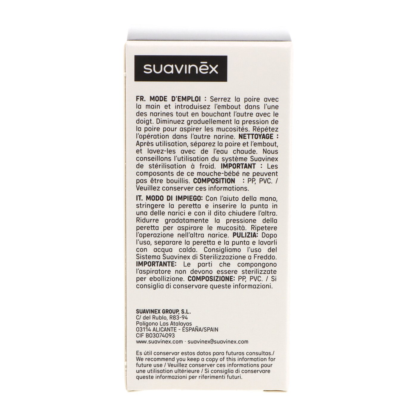 Aspirador nasal Suavinex diseñado para despejar vías respiratorias de bebés, mejorando su respiración y bienestar durante el sueño y la alimentación.COMPOSICIÓN DEL PRODUCTO
