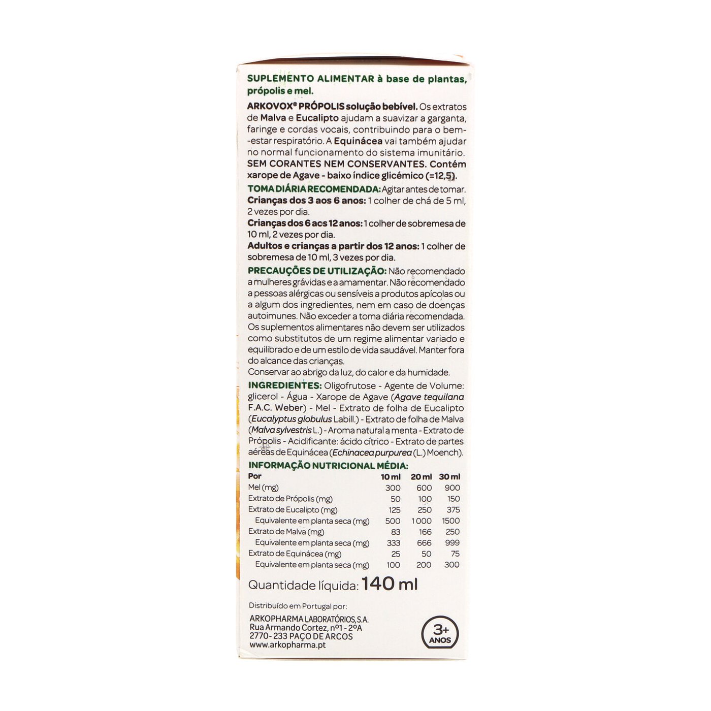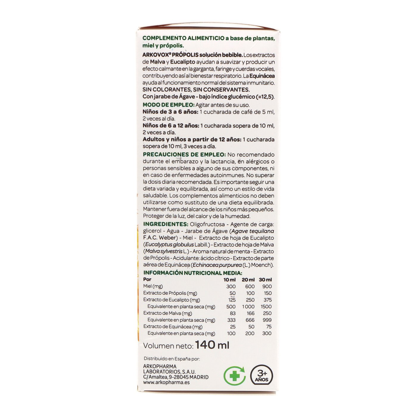Arkovox Própolis Solución Bebible es un complemento alimenticio en formato jarabe sabor menta que combina propóleo, miel y extractos de plantas para suavizar la garganta, la faringe y las cuerdas vocales, promoviendo el bienestar respiratorio y el funcionamiento normal del sistema inmunitario.