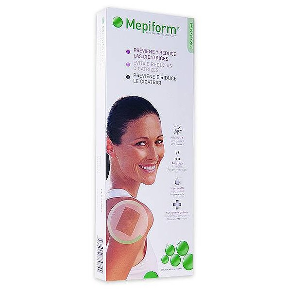 Mepiform de Molnlycke es una gama de apósitos de silicona estériles (4x30 cm) presentados en un paquete de 5. Estos apósitos están indicados para la prevención y el tratamiento eficaz de cicatrices hipertróficas y queloides. Los apósitos Mepiform incorporan la tecnología patentada Safetac® que ofrece un aporte óptimo de silicona a la piel, minimizando el dolor y el daño tisular al retirar el apósito.