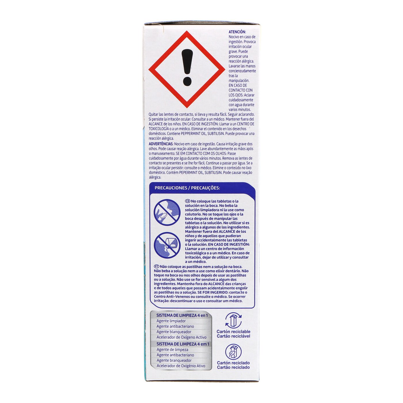 Añadir una pastilla en un vaso con agua, disolver e introducir la dentadura por al menos 15 minutos. Aclarar con agua después.