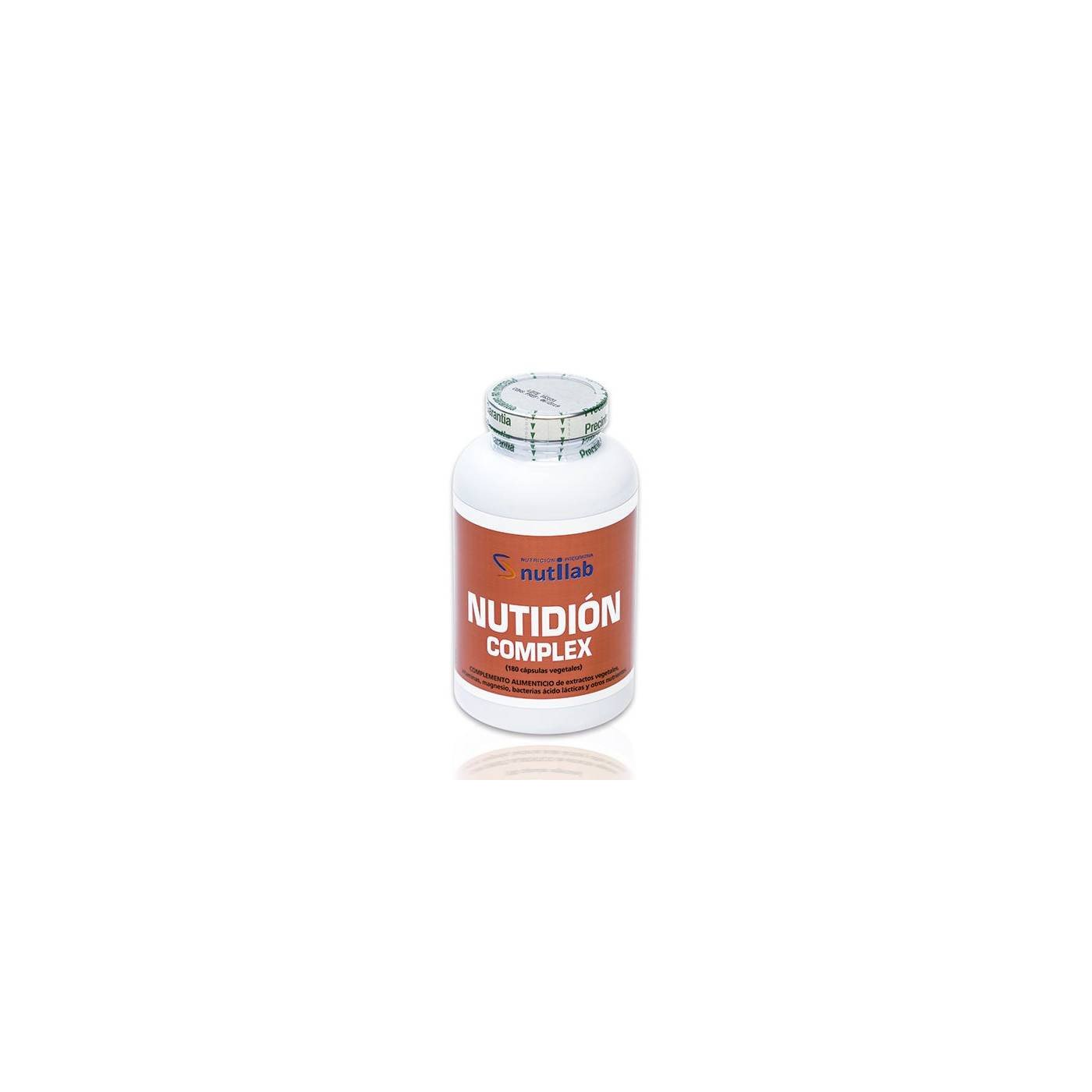 Nutidion Complex 180 Caps Nutilab: Complemento alimenticio con probióticos, prebióticos, aminoácidos, enzimas digestivas, extractos vegetales y vitaminas para apoyar la digestión. Dosificar de 1 a 3 cápsulas 3 veces al día con agua.