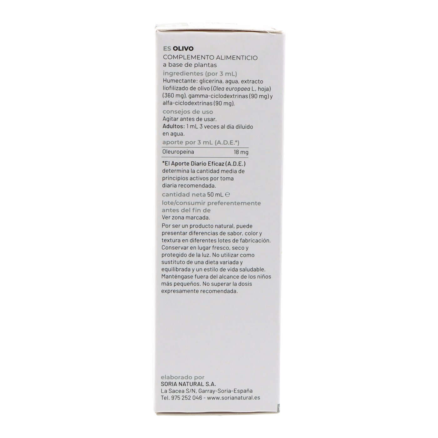 Humectante: glicerina, agua, extracto liofilizado de olivo (Olea europaea L., hoja) (360 mg), gamma-ciclodextrinas (90 mg), alfa-ciclodextrinas (90 mg). Laboratorio: Soria Natural. Peso: 50 ml.