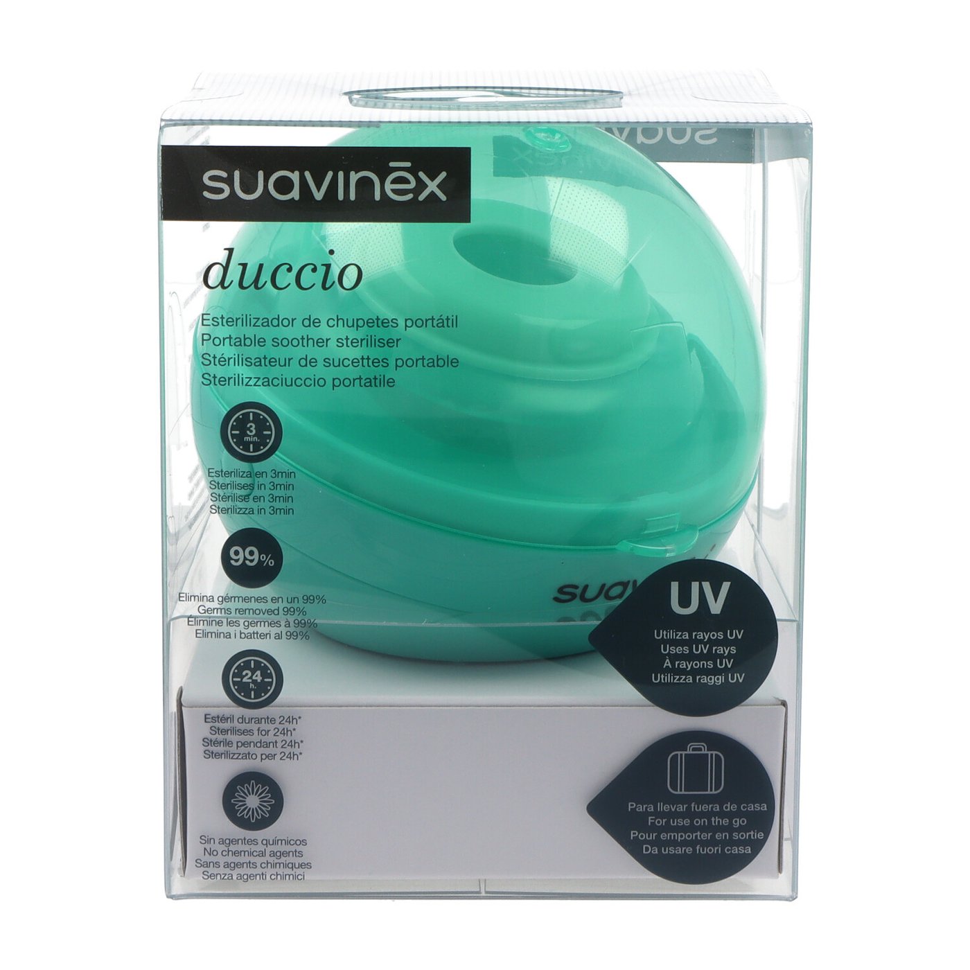 O esterilizador portátil de chupetas Suavinex Duccio é um dispositivo compacto e portátil projetado para eliminar efetivamente germes e bactérias de chupetas em apenas alguns minutos, garantindo a higiene e a saúde do seu bebê em qualquer lugar.
