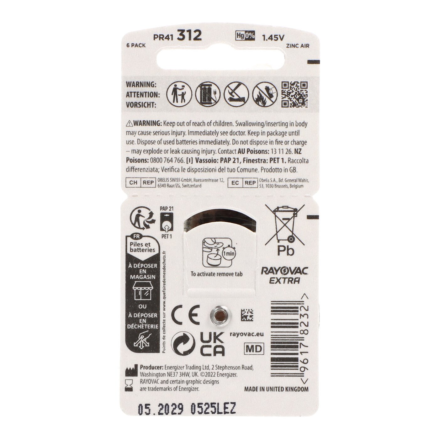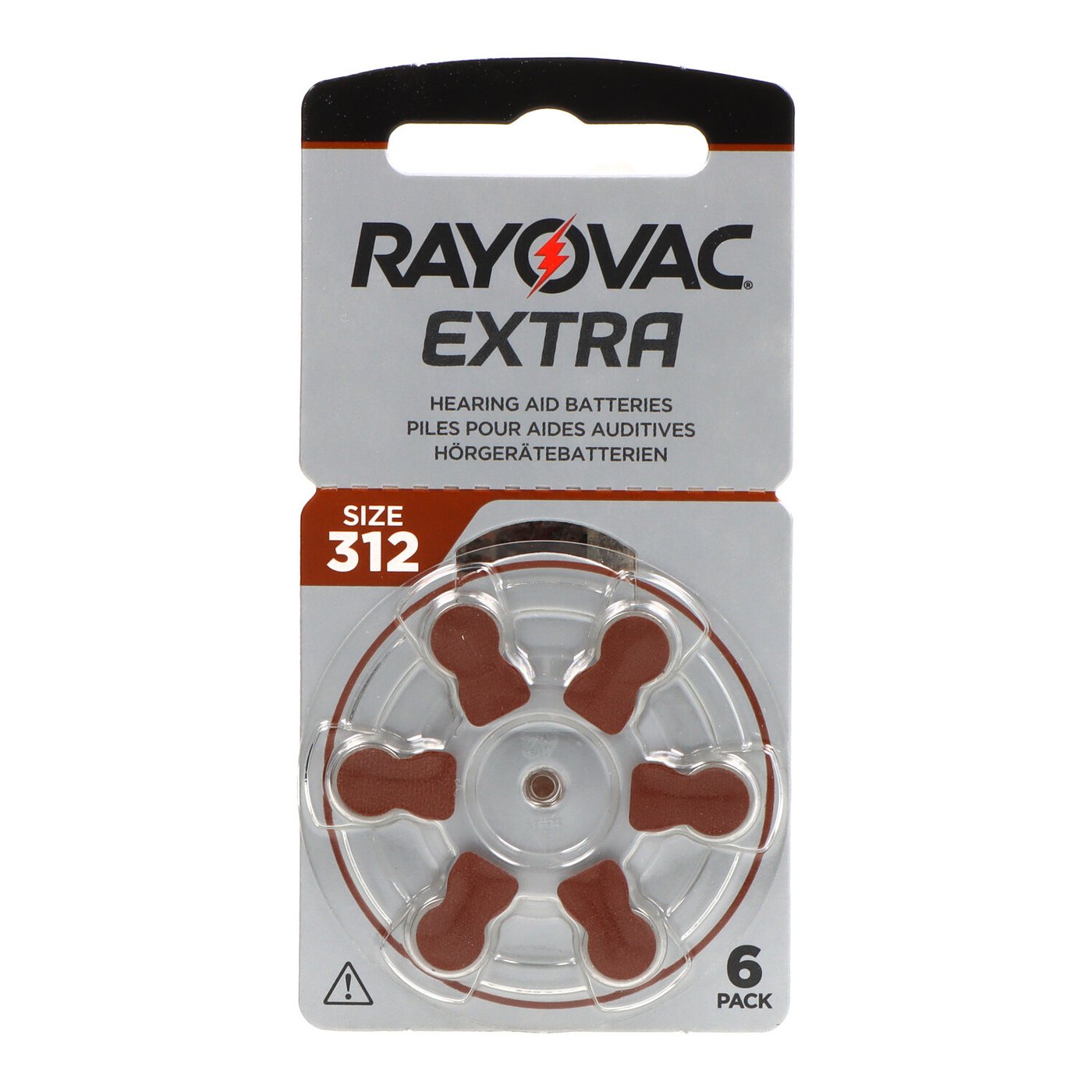 Pilhas Rayovac 312 Brown para aparelhos auditivos, pacote com 6, são compostas de zinco-ar. Eles são fabricados pela Rayovac.
