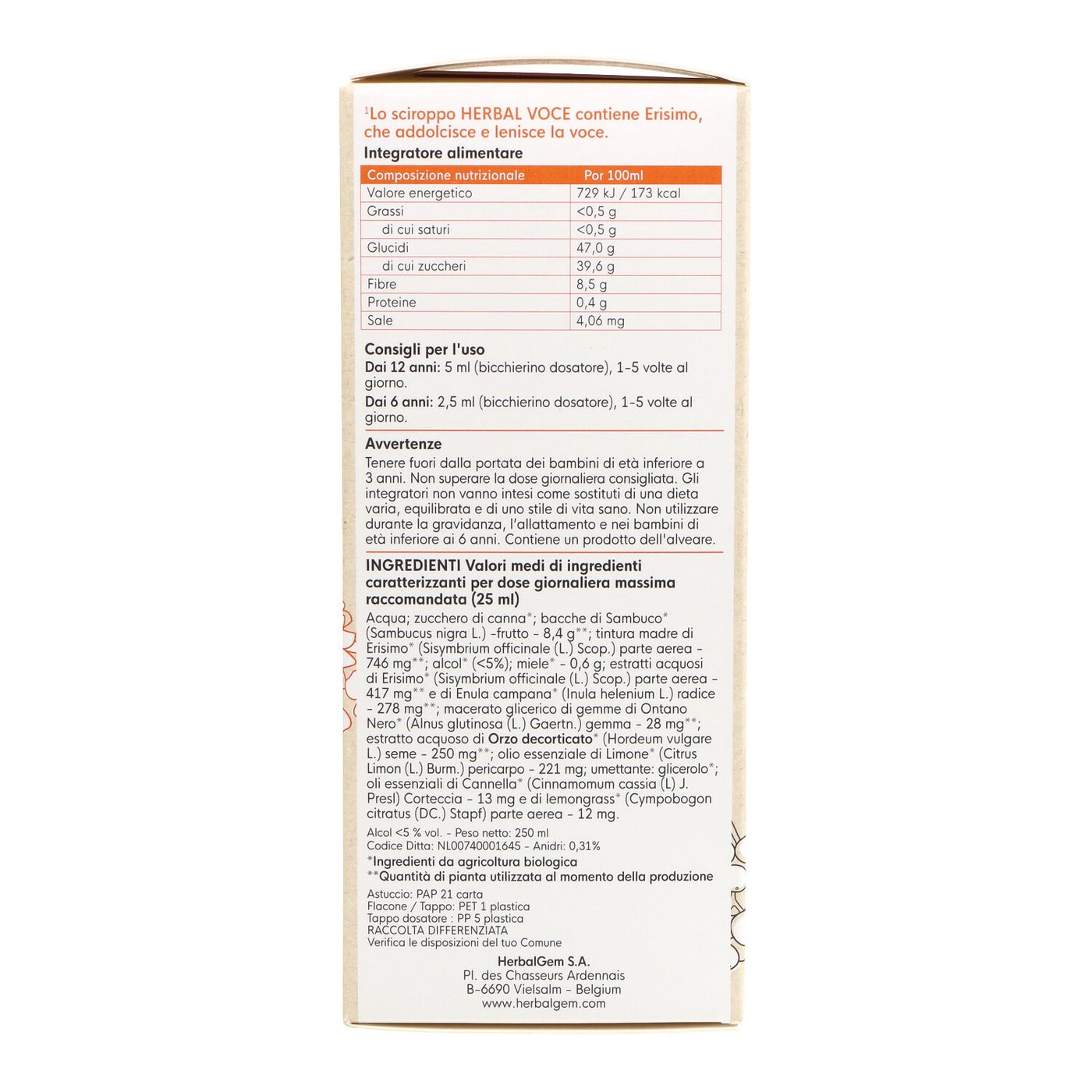 Água, açúcar de cana, sabugueiro (Sambucus nigra L.) 8,4 g, tintura-mãe de erysimum (Sisymbrium officinale (L.) Scop.) 746 mg, álcool (menos de 5%), mel 0,6 g, extratos aquosos de erysimum (Sisymbrium officinale (L.) Scop.) 417 mg e elecampana (Inula helenium L.) 278 mg, macerados glicerinados de brotos de amieiro (Alnus glutinosa (L.) Gaertn.) 28 mg, extratos aquosos de cevada (Hordeum vulgare L.) 250 mg, óleo essencial de limão (Citrus limon (L.) Burm.) 221 mg, glicerina vegetal, óleos essenciais de canela (Cinnamomum zeylanicum Blume) 13 mg e capim-limão (Cymbopogon citratus (DC.) Stapf.) 12 mg.